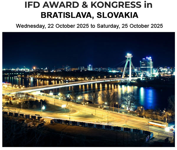 Please register via our website: IFD AWARD & KONGRESS in Bratislava – IFD Roof Registration deadline: 9 September 2025 – please register by this date at the latest. Hotel: The congress programme takes place at the Sheraton Bratislava. A limited number of rooms at special rates have been reserved for participants. Further information is provided in the programme. Participants are also free to choose other hotels in Bratislava. Please note that accommodation is not included in the congress package. All pricing and service details are available in the program. Cost is 620 Euros ($717.00) for the full registration (same for accompanying guests)
